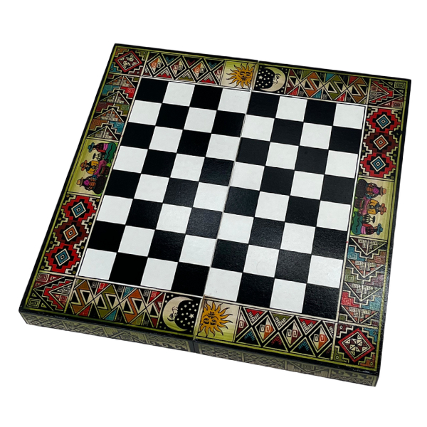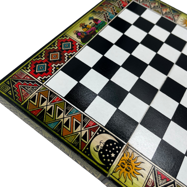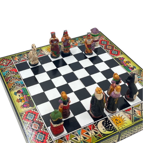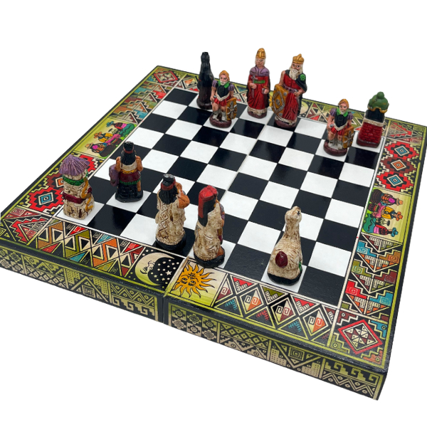 Juego de ajedrez hecho a mano con piezas talladas en madera y detalles pintados artesanalmente. Una pieza única que combina arte y tradición. Representación de la guerra entre los incas y los españoles en el siglo XVI.