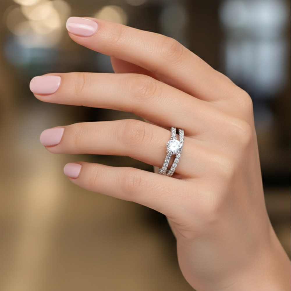 Experimenta la dualidad del glamour con nuestro anillo doble. El primero, un solitario en cristal que refleja la pureza y la luz con su centelleante claridad. El segundo, un anillo de brillos que añade un toque de destello y encanto. Juntos, forman una combinación única de elegancia y estilo. Eleva tu look con esta fusión de delicadeza y luminosidad, destacando tu individualidad con cada destello dual.