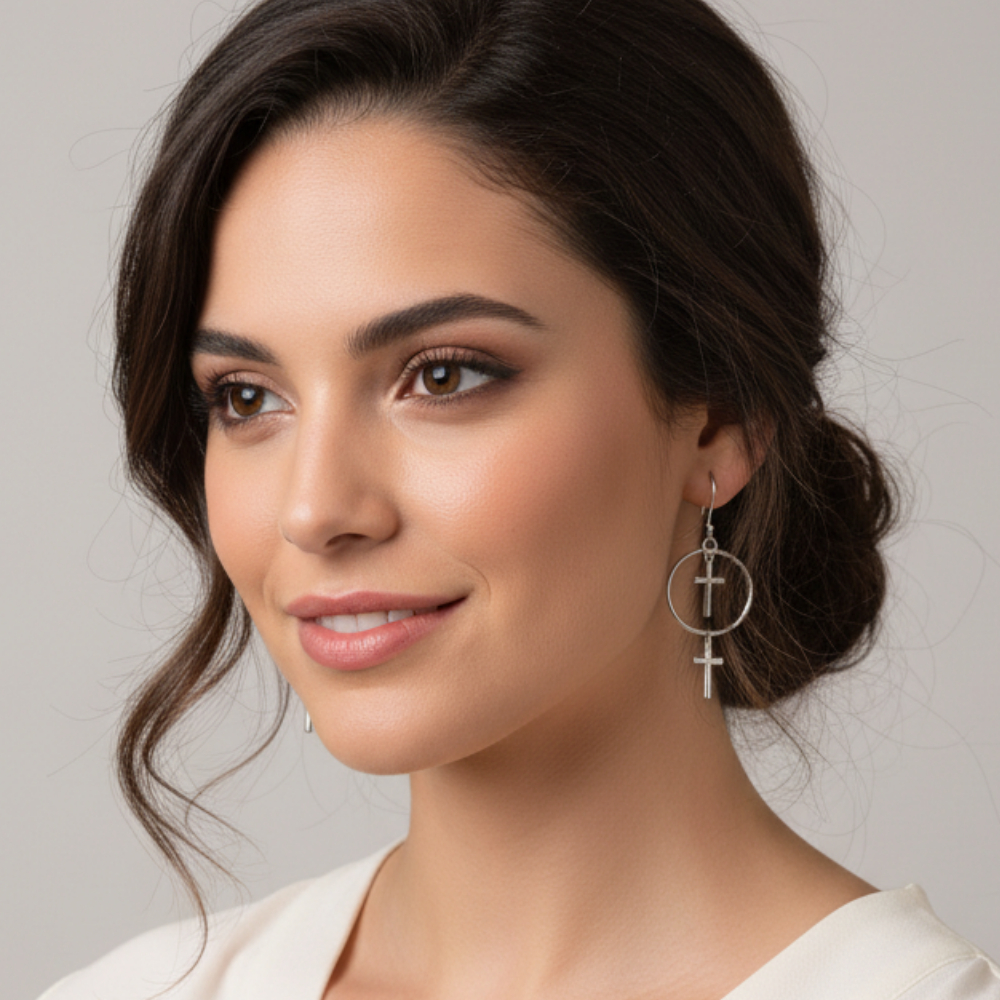 Expresa tu esencia con estos aretes que combinan la fuerza de los símbolos clásicos con la sutileza del diseño moderno. Esta pieza destaca por su armonía geométrica: un aro de plata perfectamente pulido que enmarca una cruz central, complementada por una segunda cruz que cuelga delicadamente, aportando un movimiento fluido y elegante.