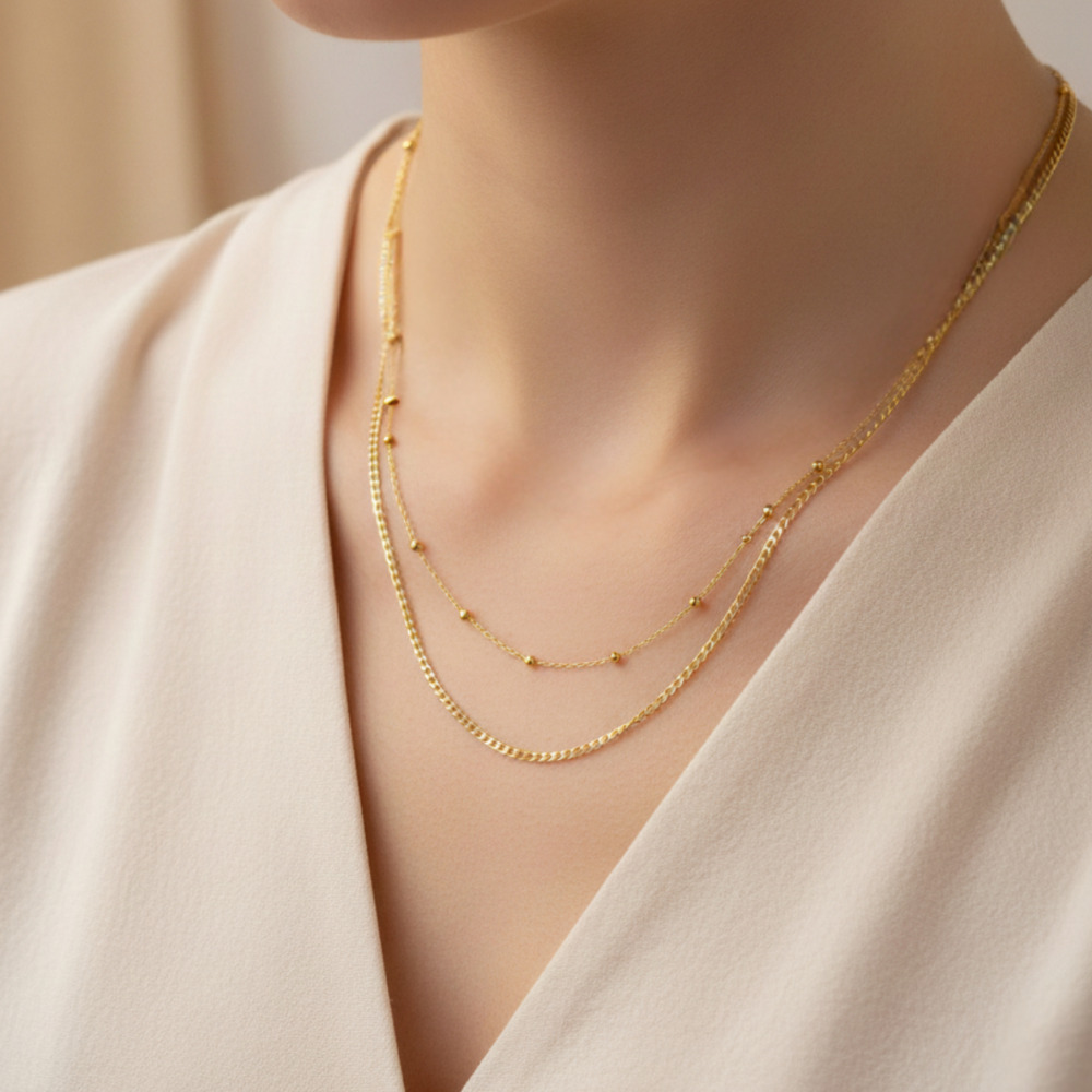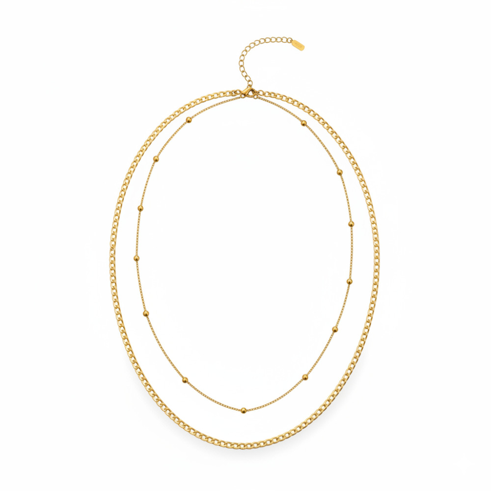 El Collar Doble Puntos Cadena – Dorado es una pieza delicada y moderna que destaca por su diseño en dos niveles. Cada cadena incorpora pequeños puntos dorados que aportan un brillo sutil y elegante, creando un efecto visual sofisticado sin perder la sencillez.