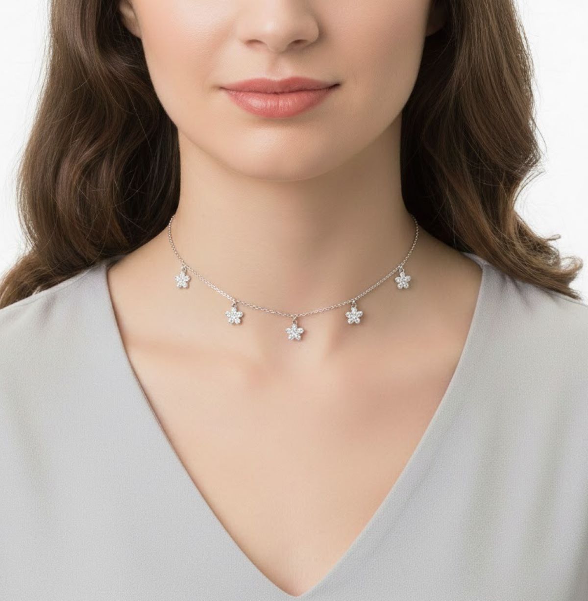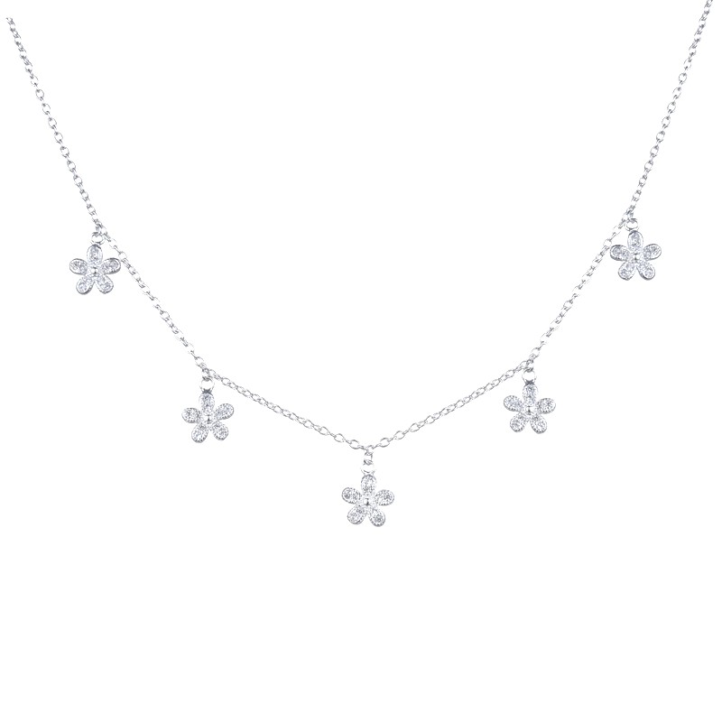 Collar de plata con delicadas flores a lo largo de la cadena, adornadas con brillos que aportan luz y feminidad. Un diseño elegante y armonioso, perfecto para realzar cualquier look.