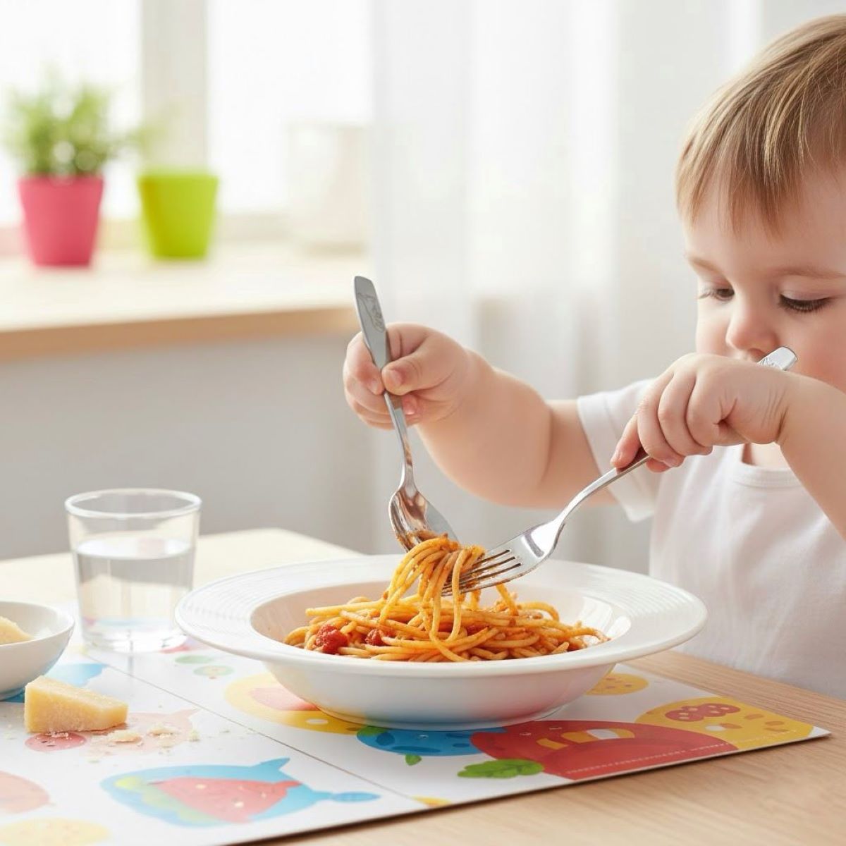Cubiertos para bebé en acero con encantador diseño de dinosaurio. Duraderos, prácticos y perfectos para acompañar sus primeras aventuras a la hora de comer.