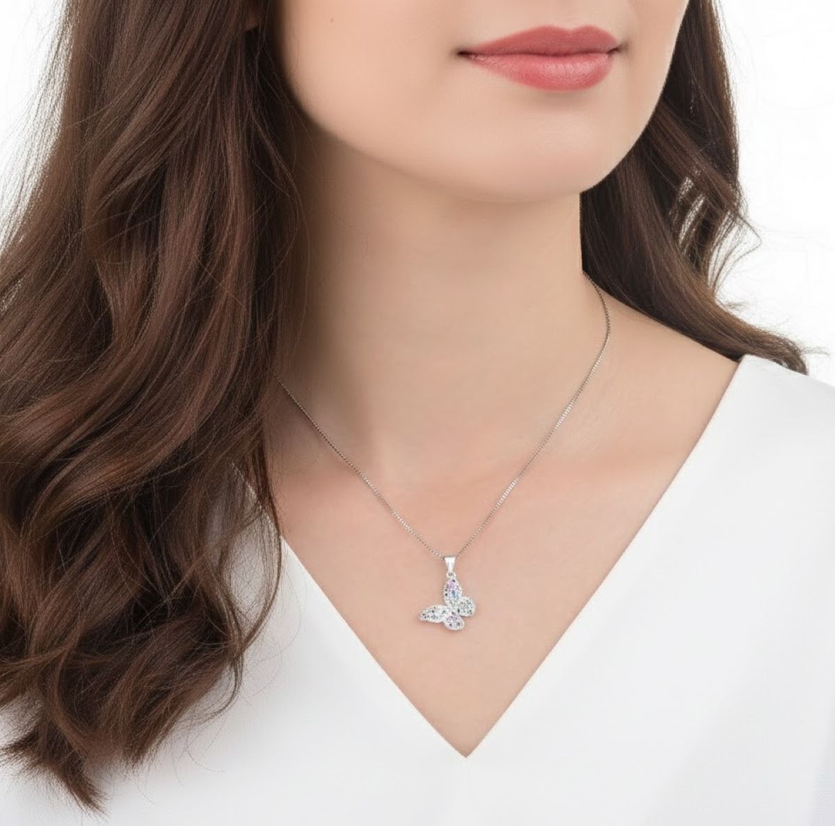 Dije de plata con diseño de mariposa y brillos de colores que reflejan luz y alegría. Una pieza delicada y llena de significado, perfecta para darle un toque femenino y vibrante a tu estilo.