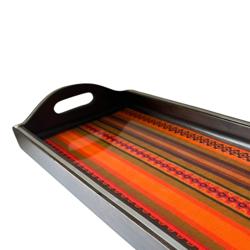 Sofisticada fuente rectangular de madera, diseñada con prácticas asas laterales y una base realzada con telar peruano auténtico, protegido cuidadosamente bajo vidrio. Cada pieza es única y resalta la belleza del tejido tradicional. Su formato amplio la convierte en un elemento protagonista en cualquier mesa. Es una muestra de artesanía detallada y genuina, que combina tradición con materiales de alta calidad para ofrecer una pieza funcional y decorativa. Ideal para servir con elegancia o para aportar un toque distintivo y acogedor a cualquier ambiente.