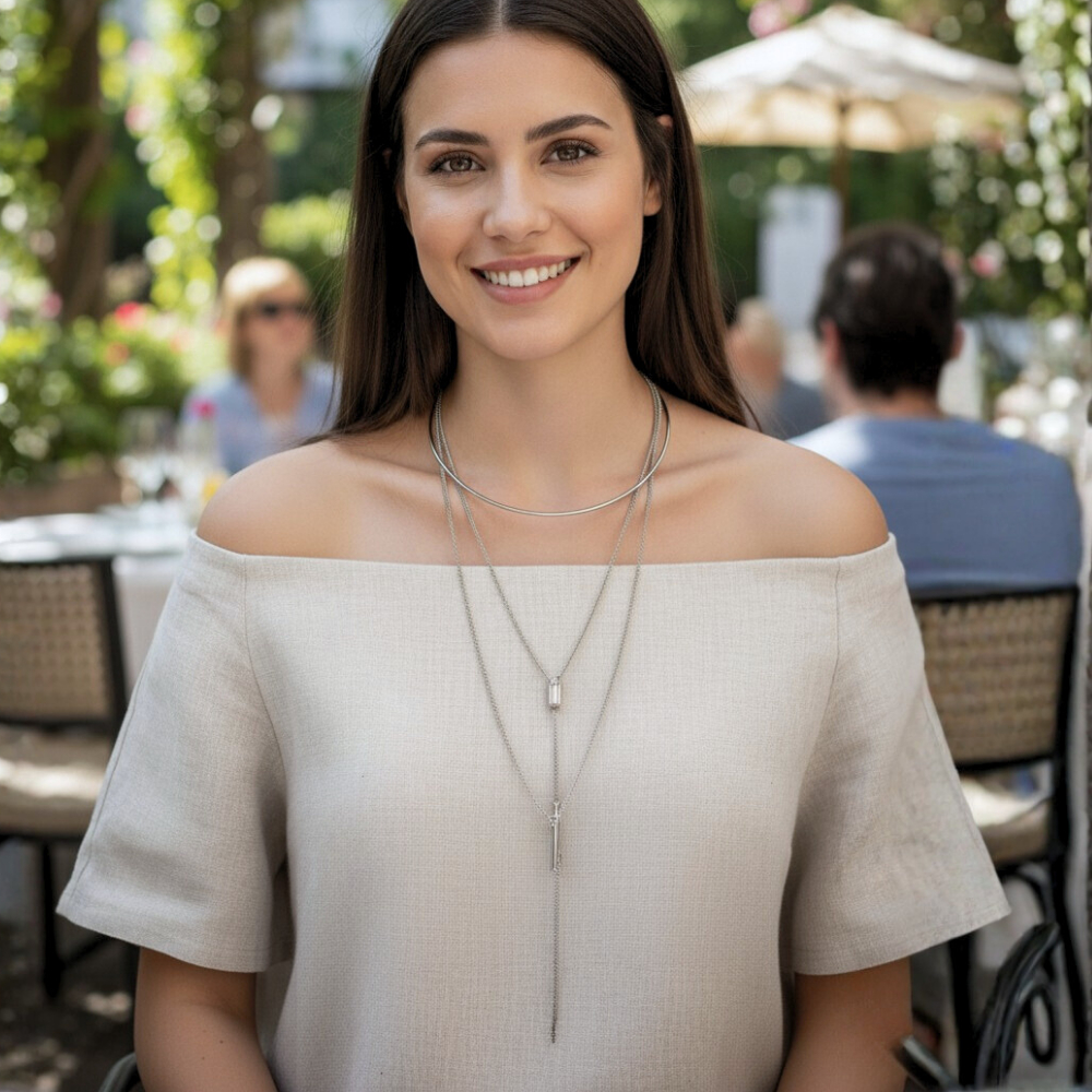 ¿Cómo combinarlo? Este collar es el protagonista absoluto de cualquier outfit. Lúcelo con un escote profundo en «V» para resaltar la caída vertical, o sobre una prenda básica de cuello alto para darle un toque industrial y chic a tu look de día. Es la elección perfecta para quienes buscan una joya con carácter, duradera y de bajo mantenimiento.