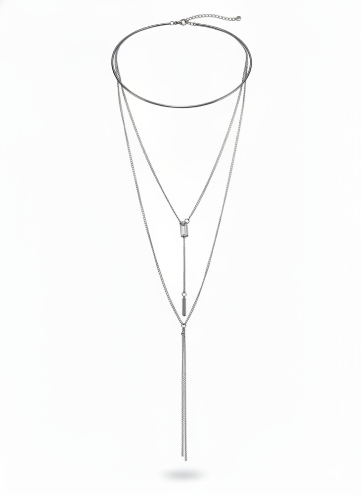 La pieza comienza con un aro rígido tipo choker que se asienta elegantemente en la base del cuello. De él nacen tres niveles de cadenas delicadas que caen armoniosamente hacia el pecho. El nivel central destaca por un sutil dije cilíndrico, mientras que el nivel más largo remata en un elegante diseño en «Y», terminando con flecos de cadena que aportan movimiento y alargan visualmente la silueta.