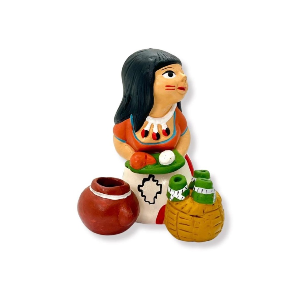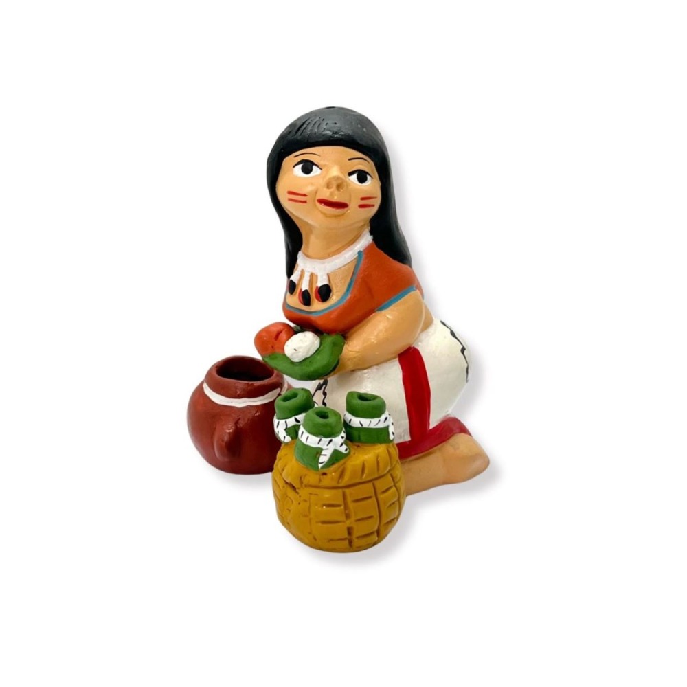 La Juanera representa con orgullo a la mujer amazónica que ofrece juanes con tradición y sabor. Una pieza artesanal que rinde homenaje a la cultura y fuerza de la selva peruana.