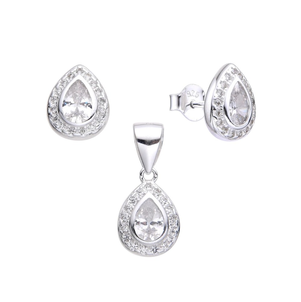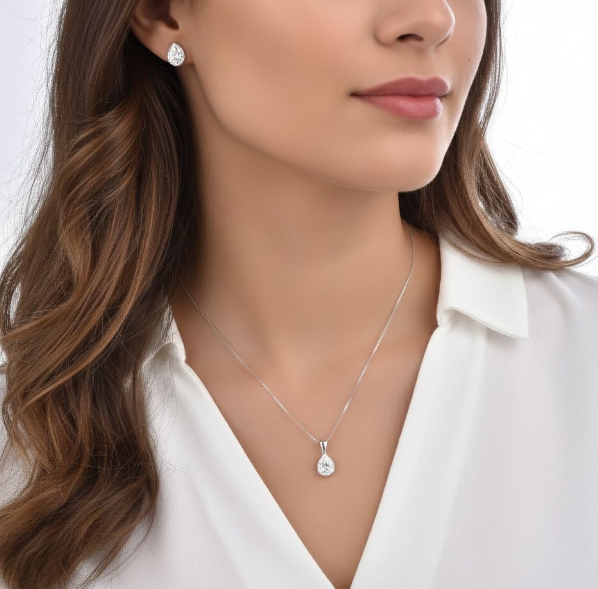Delicado juego de plata con diseño de gota y cristal brillante que captura la luz con cada movimiento. Una pieza elegante y llena de encanto, perfecta para resaltar tu belleza en momentos especiales.
