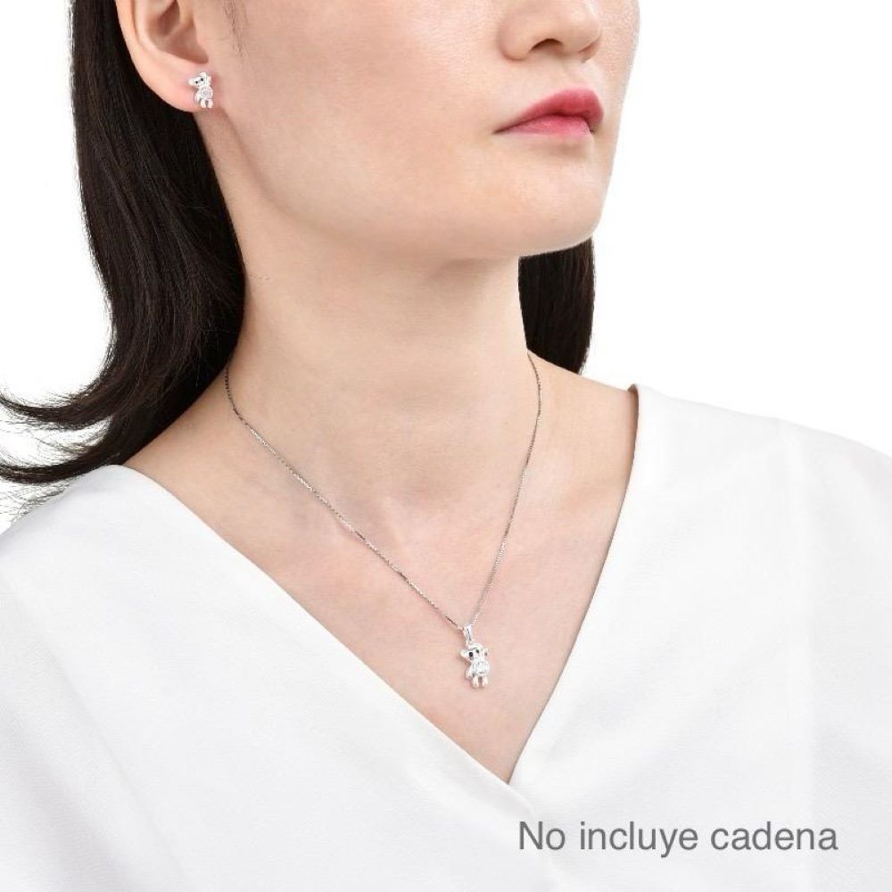 Juego de aretes y dije en forma de osito con circones brillantes, un diseño tierno y elegante ideal para cualquier ocasión. Pregunta por nuestras opciones de cadenas para acompañarlo y crear el set perfecto.
