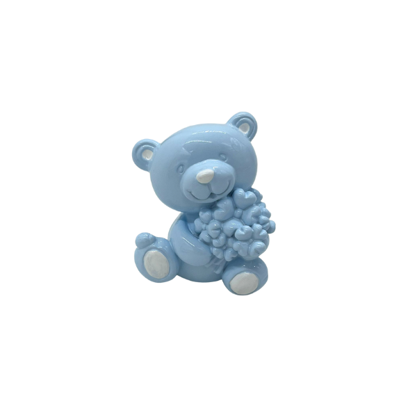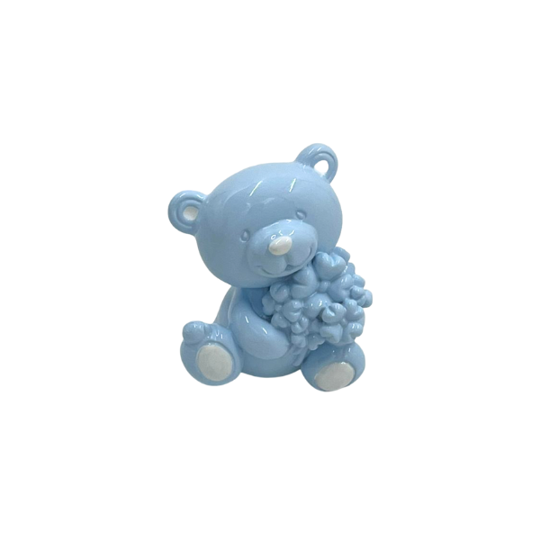 Dulce figura decorativa de osito en color celeste con ramo de flores, elaborada en resina y acabada con pintura italiana resistente a rayos UV. Ideal para habitaciones infantiles, bautizos o celebraciones especiales. Su diseño delicado y duradero lo convierte en un detalle encantador que aporta ternura y estilo a cualquier espacio.