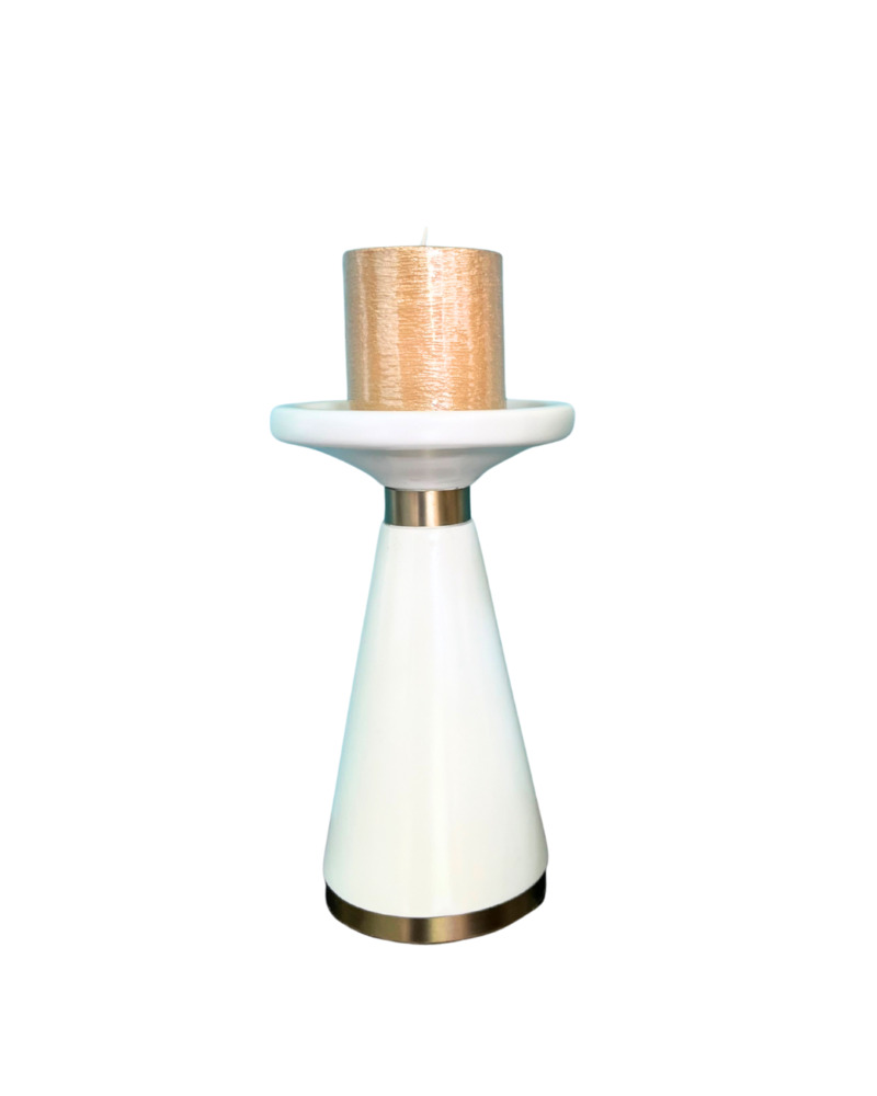 Elegante y contemporáneo, este portavelas en tono blanco marfil ha sido diseñado para aportar sofisticación y equilibrio visual a cualquier espacio. Su forma cónica estilizada y el detalle metálico en dorado cepillado lo convierten en una pieza moderna y versátil, ideal para salas, comedores, recibidores o ambientes corporativos.