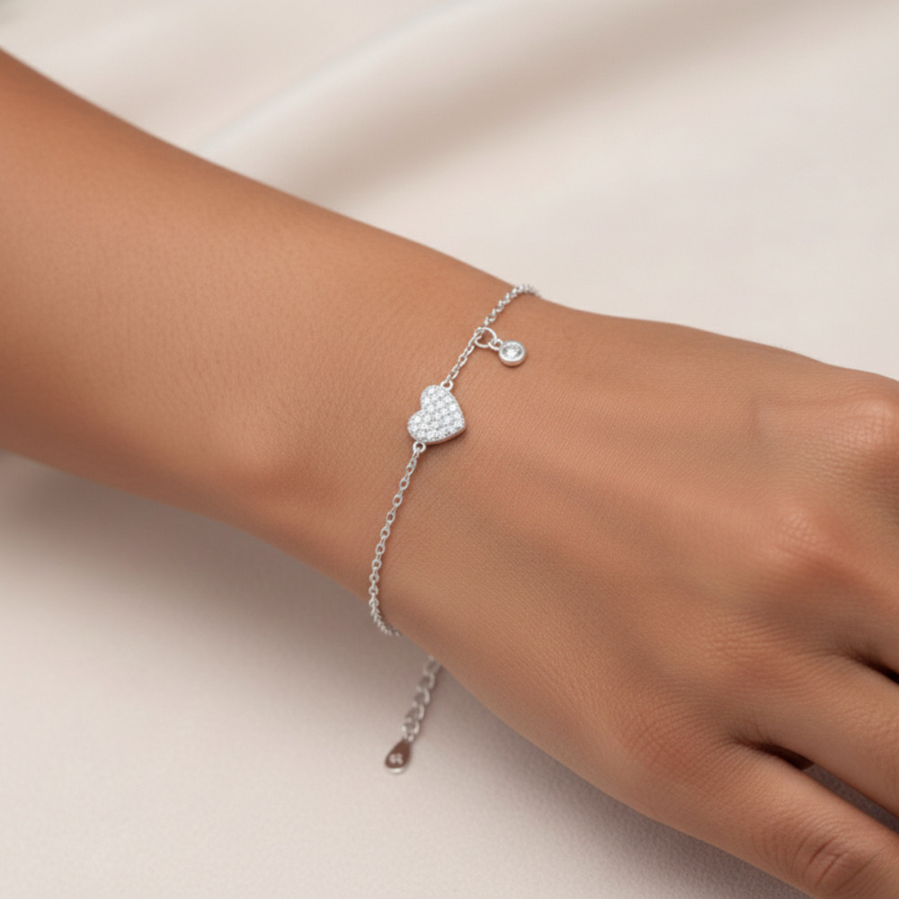 Pulsera de plata fina con dije corazón. Diseño casual y delicado, ideal para looks femeninos.