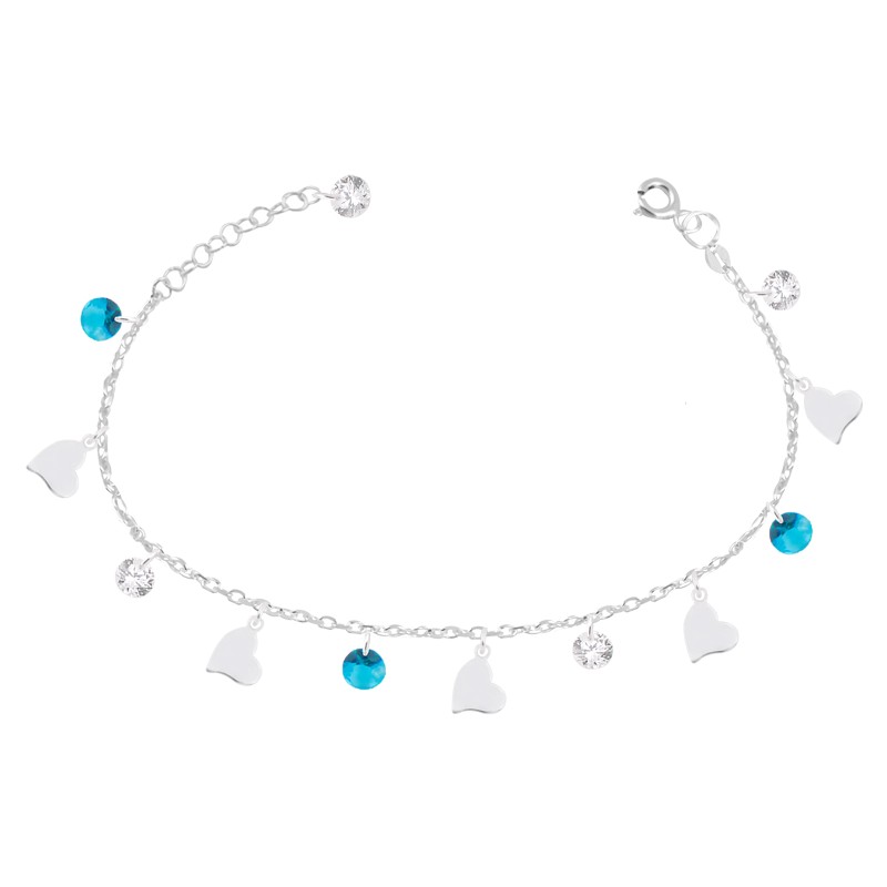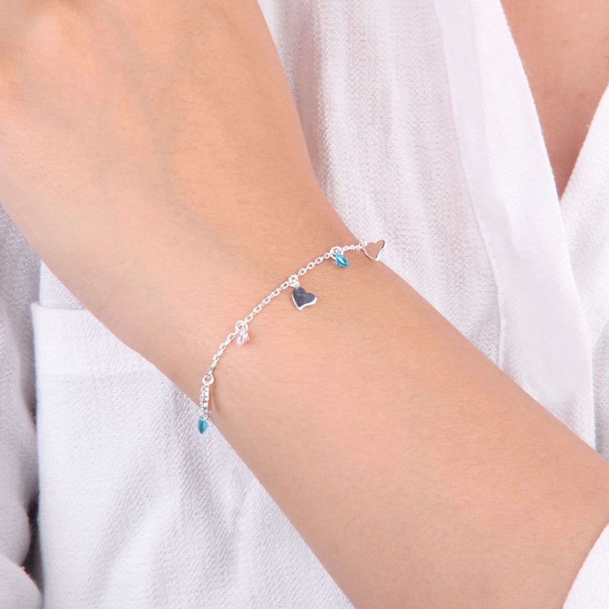 Un detalle lleno de encanto y buena energía. Esta pulsera con pequeños corazones y puntos de luz en tono turquesa destaca por su brillo sutil y diseño delicado que combina con cualquier estilo.