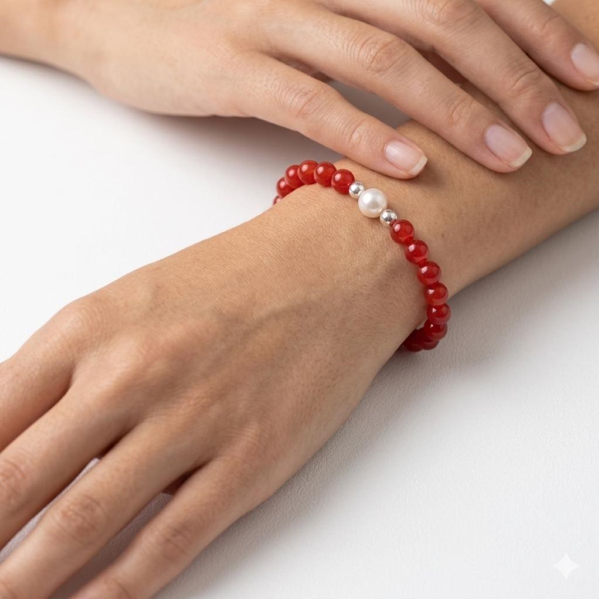 Elegante pulsera elaborada en plata de ley 925 que combina la intensidad de la Cornalina con la delicadeza natural de la perla. Su diseño equilibrado aporta un estilo sofisticado y versátil, ideal para complementar tanto looks formales como casuales. Una pieza atemporal que refleja fuerza, armonía y distinción en cada detalle.