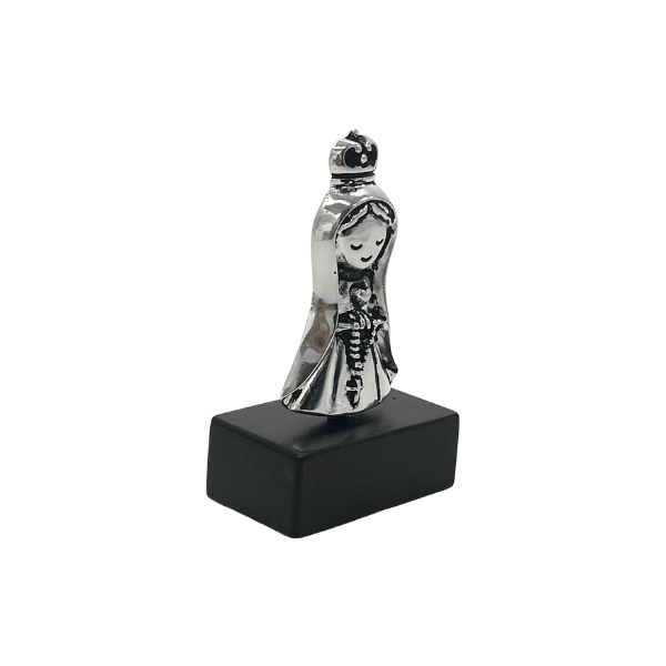 Una representación de esperanza y fe. La imagen de la Virgen de Fátima, conocida por sus mensajes de paz y consuelo, está delicadamente trabajada en peltre. Su base de madera brinda firmeza y calidez, creando una pieza ideal para espacios de oración o como regalo espiritual. Un recordatorio constante de protección y amor divino.
